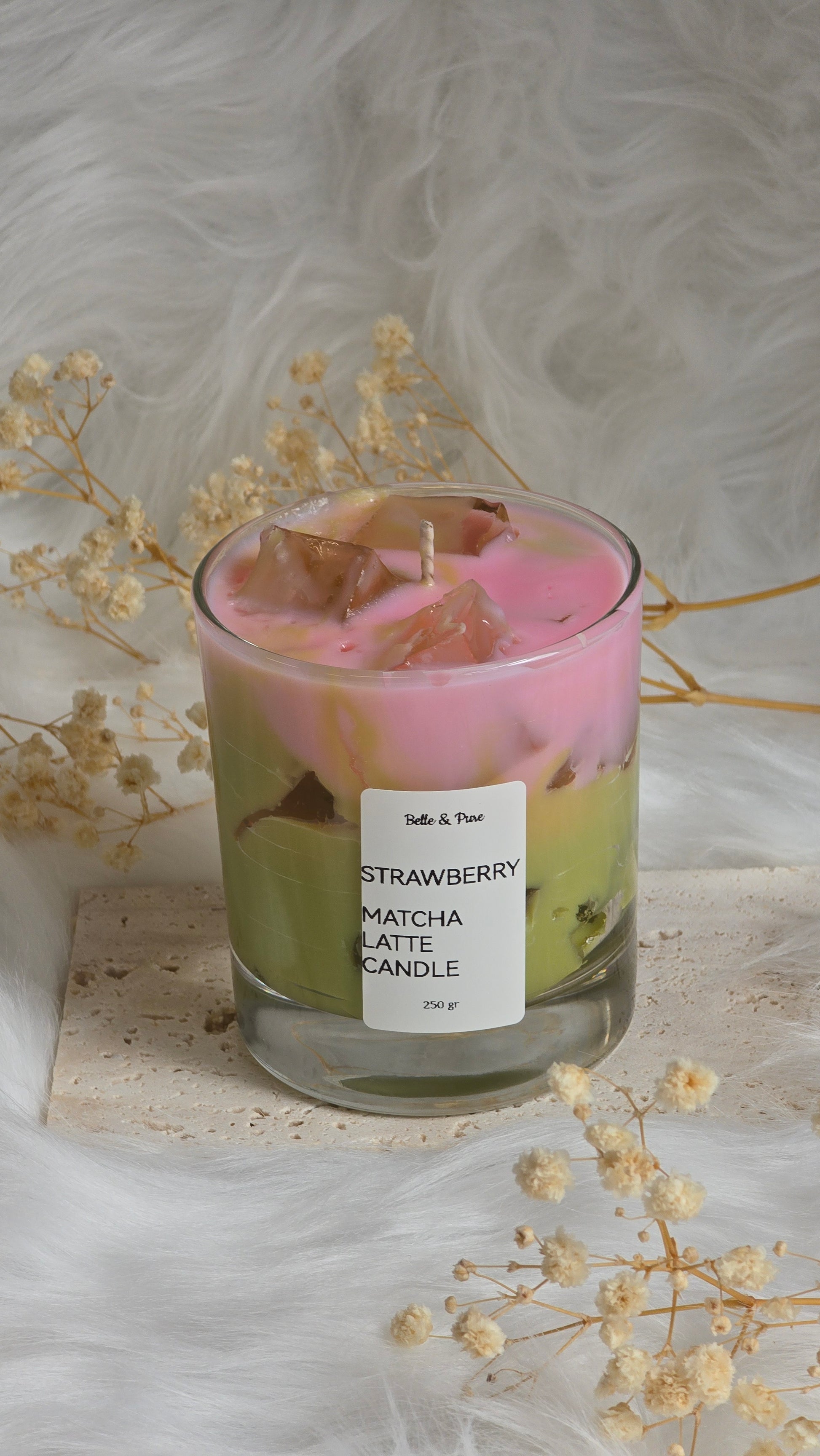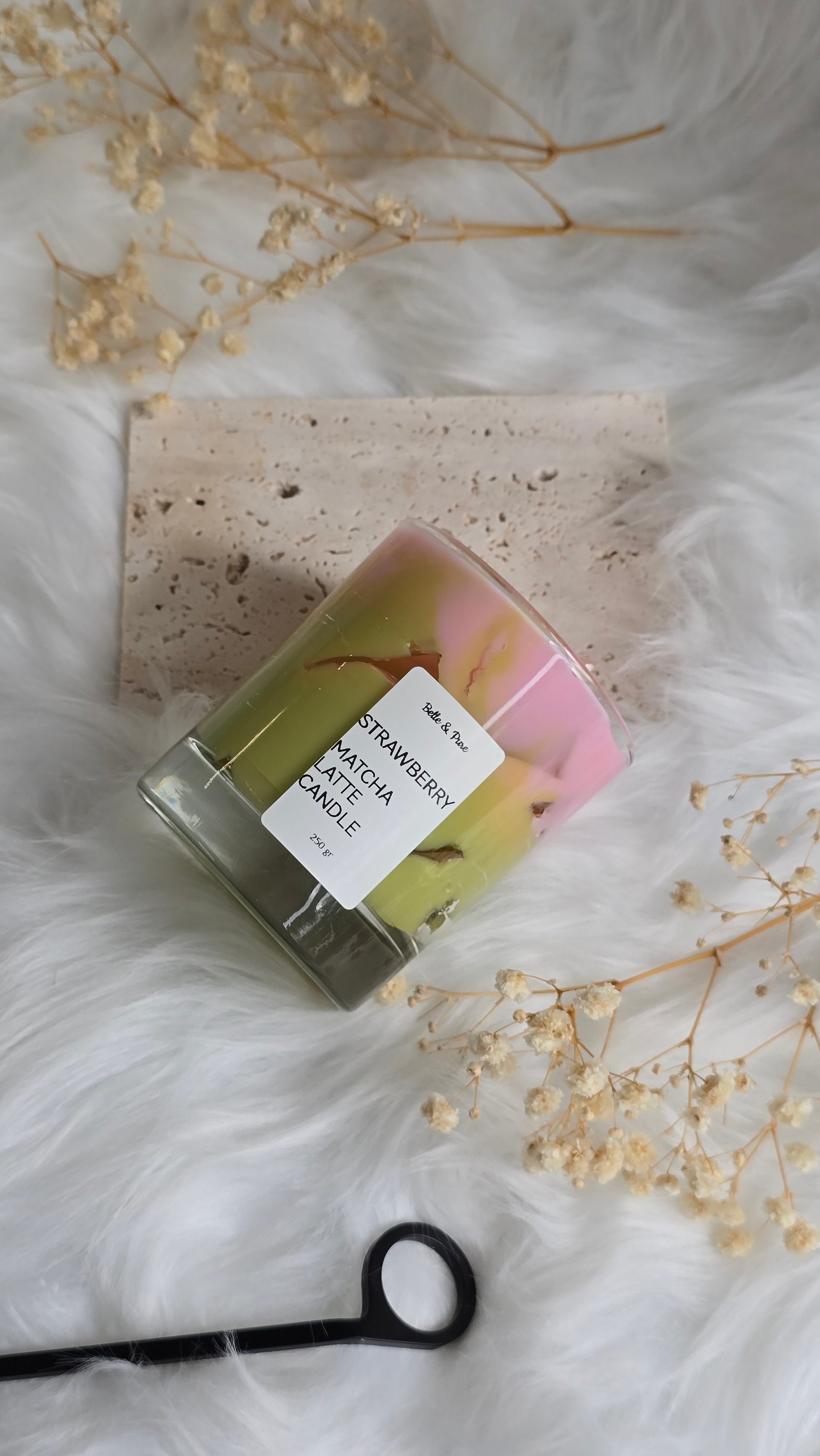 Hand-poured using 100% vegan soy wax, this candle is a must-have for matcha lovers, strawberry fans, and anyone who appreciates eye-catching home décor.